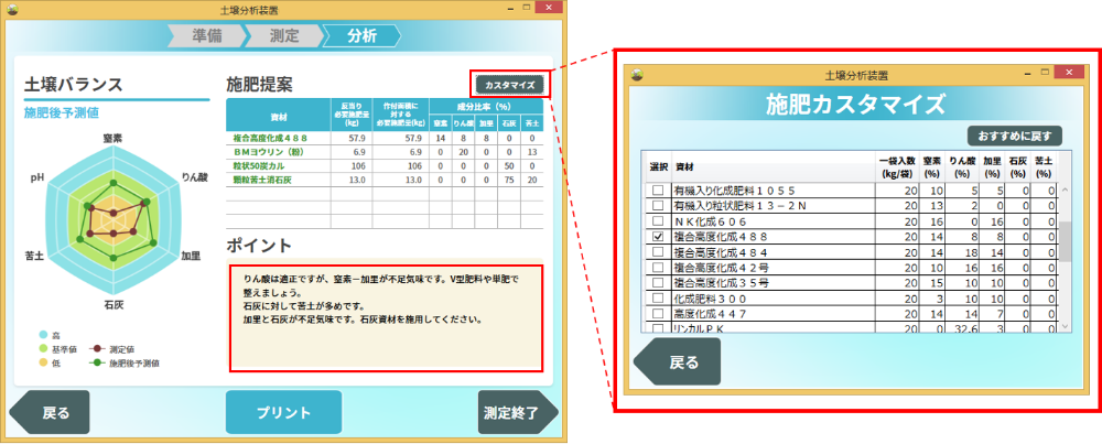 ●測定結果をもとに各養分の量をチャートで示すほか、作物の種類に適した肥料の種類や施肥量の提案も表示されます。